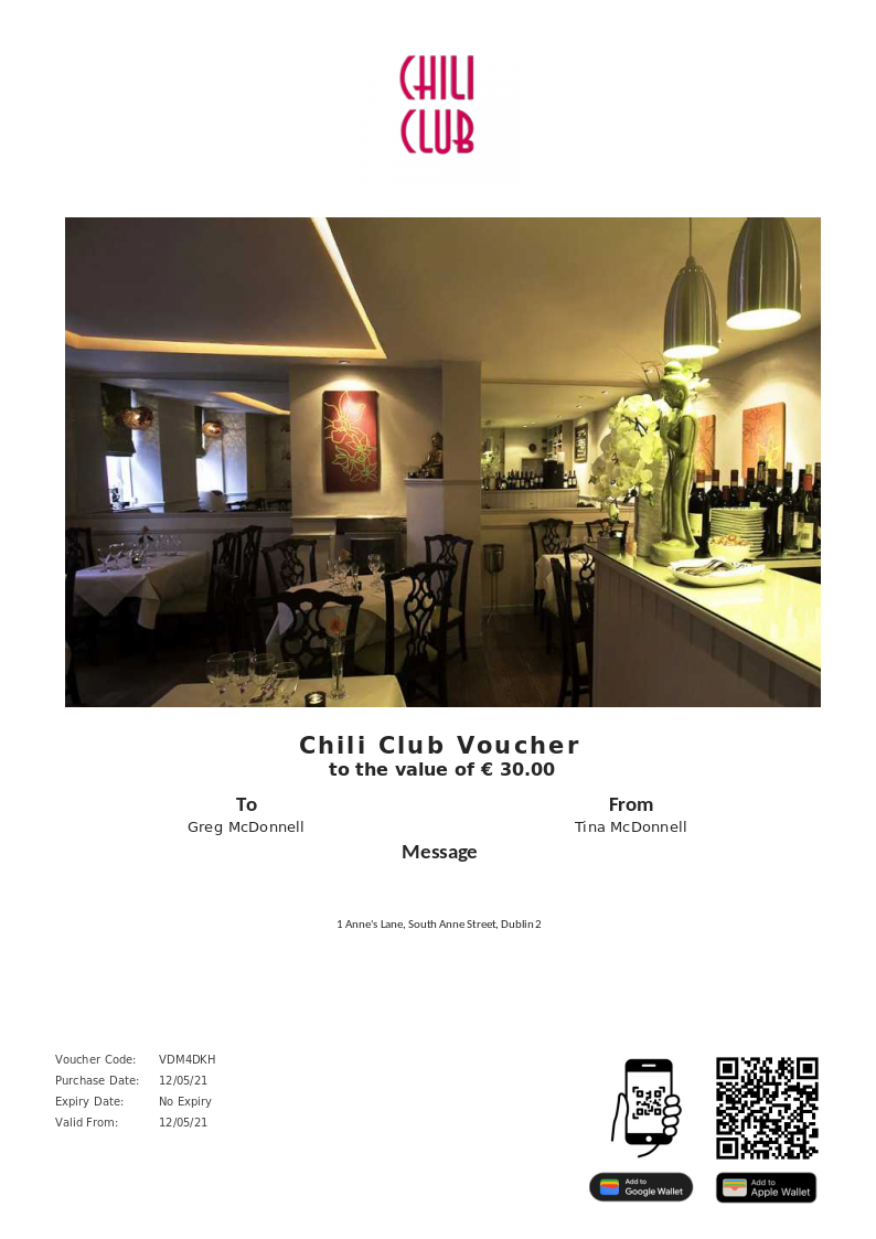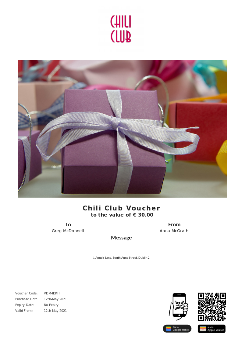 Chili Club allows you to purchase instantly printable gift vouchers, special offers and tickets using the Voucher Connect platform.